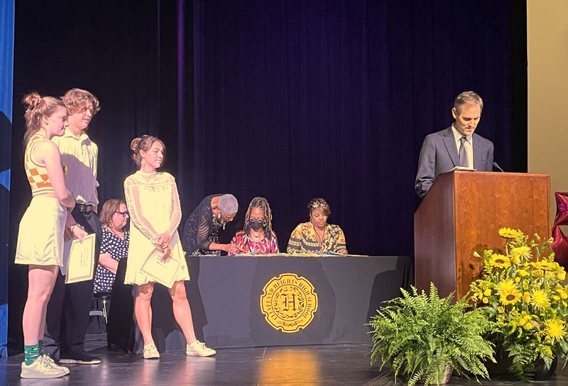 Heights Hockey Alumni Brian West ('96) presents Scholarship Awards to Celia, Vince and Maria at the Senior Recognition Awards Program, May 25th 2022 |